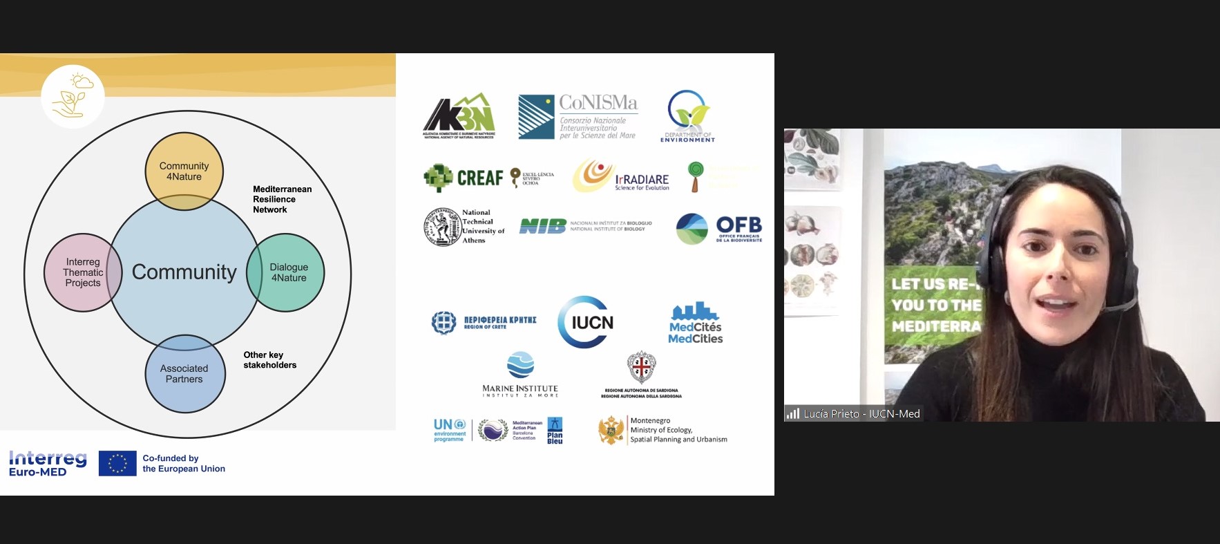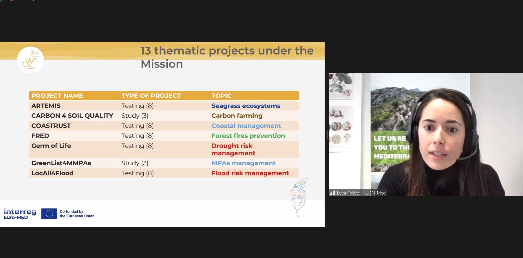 The Centre for Mediterranean Cooperation of the International Union for Nature Conservation (IUCN Med) represented the Mission for Natural Heritage during the event. Mrs. Lucía Prieto Fustes delineated the Mission’s commitment to protecting, restoring and valorising the natural environment and heritage, in line with the policies and objectives of the European Commission. The SOLVE the CHALLENGE awareness campaign, the annual institutional dialogue, and the four Working Groups on Area-based Conservation, Climate Change Mitigation and Adaptation, Evaluating the Socio-Economic Importance of Biodiversity, and Ecosystem Restoration and Nature-based Solutions, were highlighted as key activities in which attendees could participate. Finally, the topics of the recently approved Interreg Euro-MED thematic projects were disclosed. Seagrass ecosystems, carbon farming, coastal management, forest fire prevention, drought risk management, MPAs management, flood risk management, sea level rise, forest management, ports environmental quality, and wetlands will be some of the matters that will guide the work of the Natural Heritage Mission in the upcoming years.